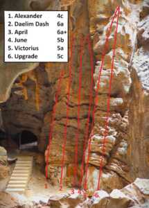 These routes remain dry and shaded all year long. Half of both sectors on the outside remain shaded and dry thanks to the overhanging caves. The caves breathe out a beautiful cool 24° Celsius.